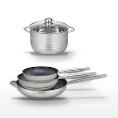 - COMPOSITION : COMPOSITION : Poêles en acier inoxydable 18/10 avec revêtement sans PFAS, faitout en inox avec couvercle en verre résistant.
