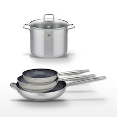 - COMPOSITION : COMPOSITION : Poêles en acier inoxydable 18/10 avec revêtement sans PFAS, faitout en inox avec couvercle en verre.