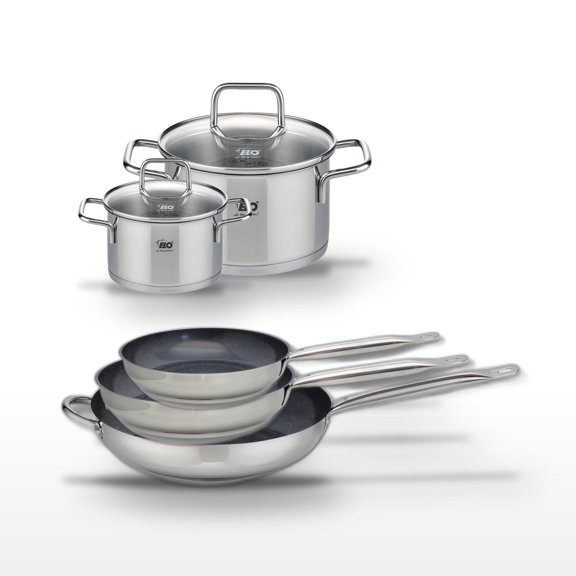 - DESCRIPTION : Cet ensemble Elo propose trois poêles céramiques sans PFAS et deux faitouts en inox, garantissant une cuisson saine et homogène.