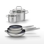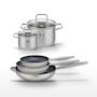 - COMPOSITION : Poêles en acier inoxydable avec revêtement céramique, faitouts en inox avec couvercles en verre.