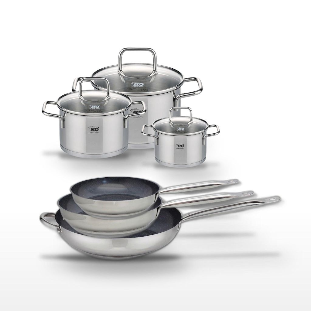 - DESCRIPTION : DESCRIPTION : Cet ensemble Elo comprend trois poêles céramiques sans PFAS et trois faitouts en inox pour une cuisine saine et efficace.