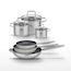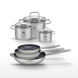 - COMPOSITION : COMPOSITION : Poêles en acier inoxydable avec revêtement céramique, faitouts en inox avec couvercles en verre.