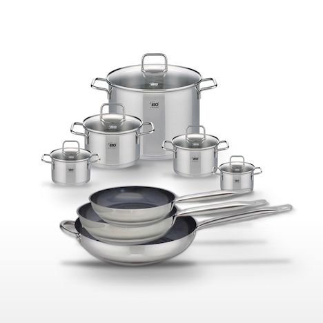 - COMPOSITION : COMPOSITION : Poêles en acier inoxydable avec revêtement céramique, faitouts en inox et verre.