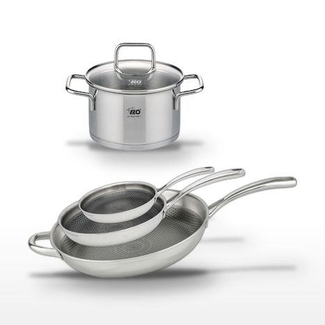 - DESCRIPTION : Ce lot comprend trois poêles en inox 18/10 et un faitout. Idéal pour une cuisson homogène et saine grâce à son revêtement antiadhésif sans PFAS.