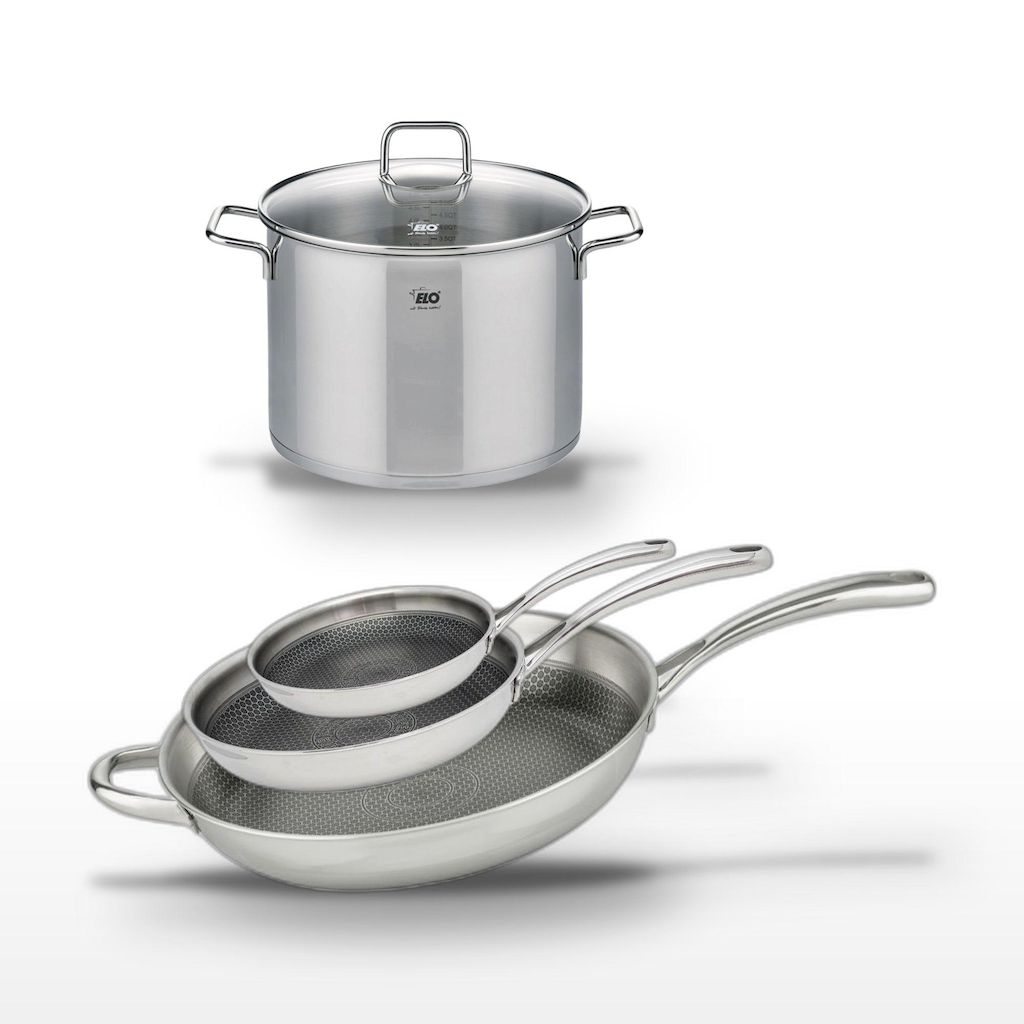 - DESCRIPTION : Ensemble de poêles et faitout en inox 18/10 Elo Relief Evolution pour une cuisson saine et homogène.
