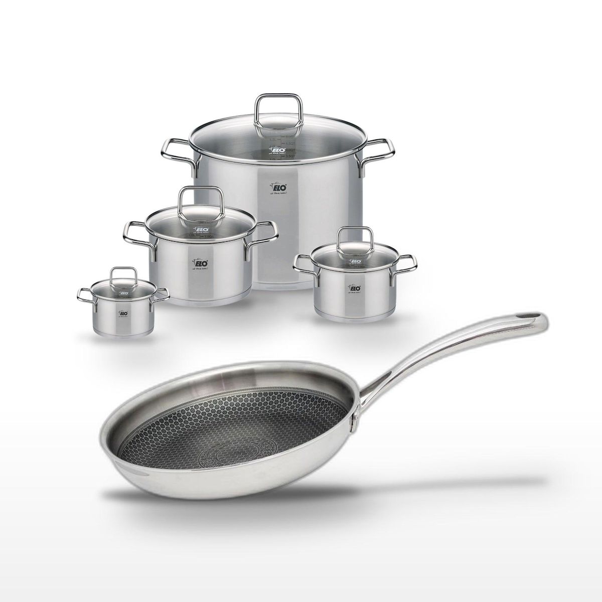 - DESCRIPTION : Lot de faitouts et poêle en inox Elo Relief Evolution pour une cuisine professionnelle à domicile.