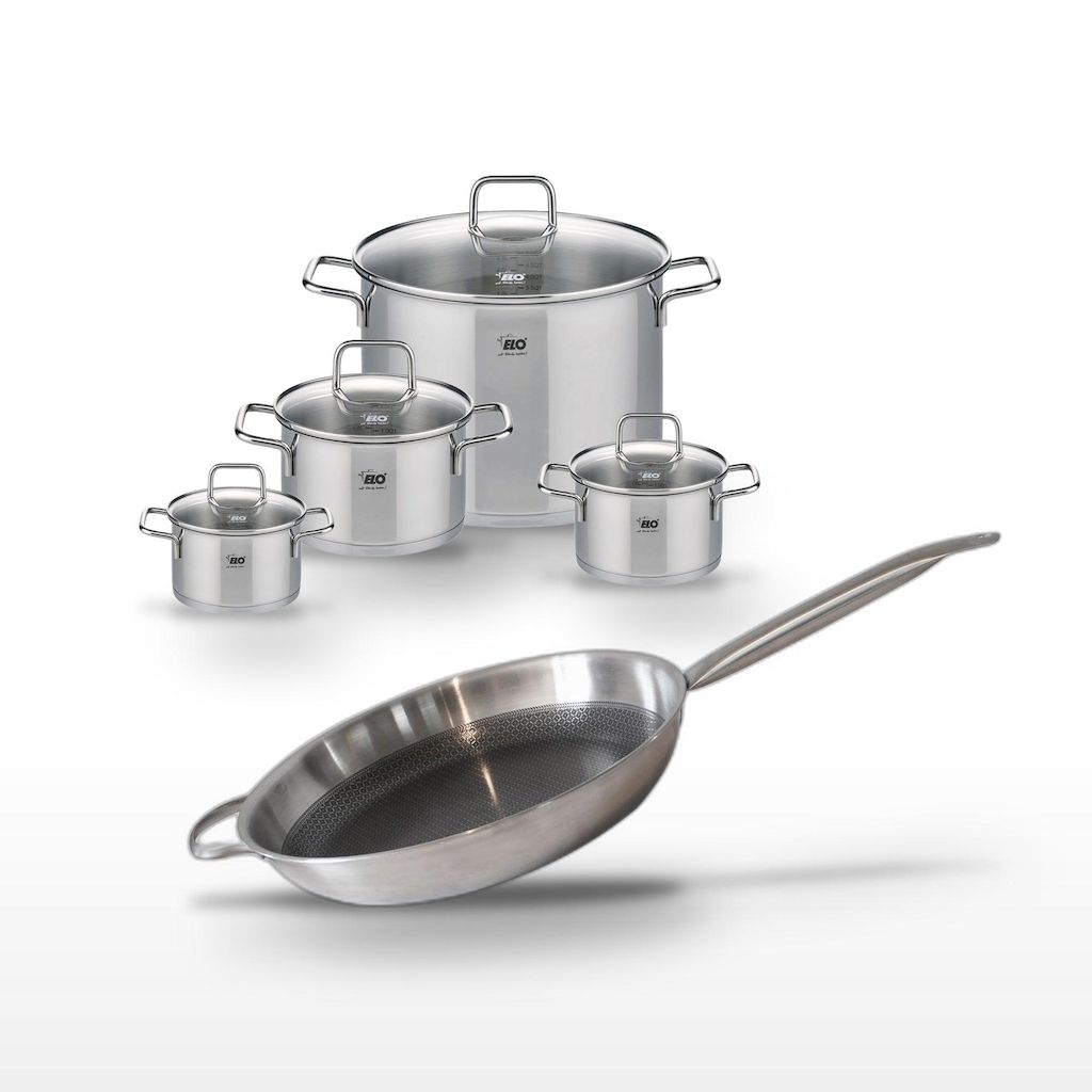Lot de 4 Faitouts en inox Elo Relief Solution 14/16/20/26 cm et Poêle 32 cm