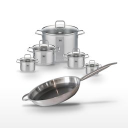 - COMPOSITION : Acier inoxydable pour les faitouts, 3 couches incluant aluminium pour la poêle.