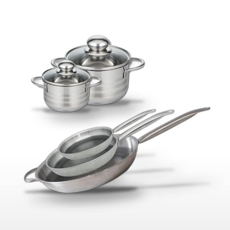 - DESCRIPTION : DESCRIPTION : Ensemble de poêles et faitouts Elo Relief Solution en acier inoxydable 18/10, avec revêtement antiadhésif sans PFAS.