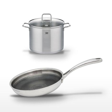 DESCRIPTION : Ensemble Elo comprenant un faitout de 26 cm et une poêle de 28 cm, parfait pour une cuisine saine et homogène.PETIT + : Le revêtement antiadhésif de la poêle et le fond capsulé du faitout assurent une cuisson optimale et économe.COMPOSITION : Acier inoxydable 18/10 pour les deux pièces