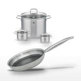 - COMPOSITION : COMPOSITION : Acier inoxydable 18/10, aluminium et verre. Revêtement antiadhésif ELODUR® Select sans PFAS pour la poêle.