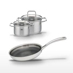 - COMPOSITION : Acier inoxydable de haute qualité pour une durabilité exceptionnelle. Poêle avec revêtement ELODUR® et faitouts avec couvercles en verre.