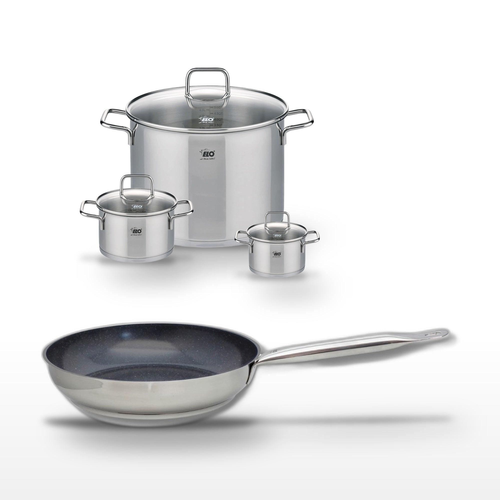 - DESCRIPTION : Ensemble Elo avec une poêle céramique 24 cm et trois faitouts en inox, polyvalents pour toute cuisine.