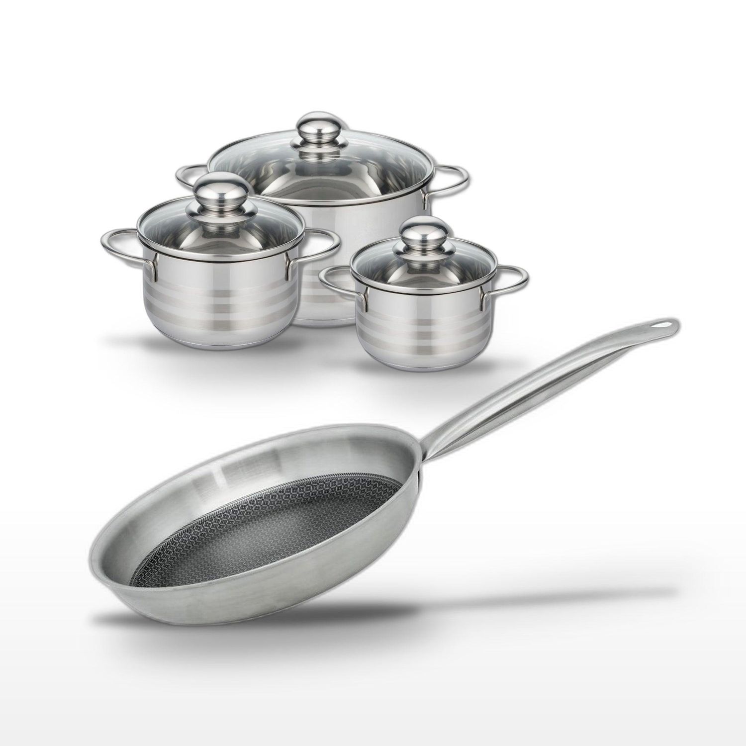 - DESCRIPTION : Lot de cuisine Elo Relief Solution, incluant une poêle 24 cm et trois faitouts 20/16/14 cm en acier inoxydable.