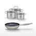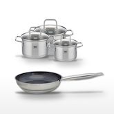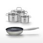 - COMPOSITION : La poêle est en acier inoxydable avec un revêtement sans PFAS. Les faitouts sont en inox avec couvercles en verre.