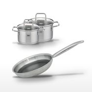 - COMPOSITION : Acier inoxydable 18/10, aluminium, revêtement ELODUR® Select sans PFAS pour la poêle, inox pour les faitouts.