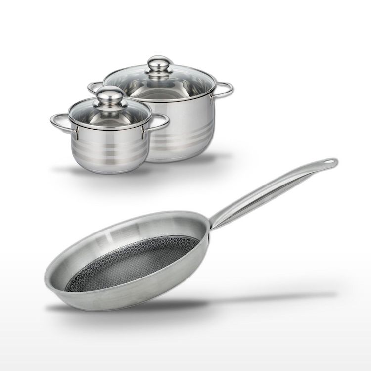 - DESCRIPTION : Ce lot Elo Relief Solution inclut une poêle de 24 cm et deux faitouts de 16 et 20 cm, tous en acier inoxydable 18/10, offrant une cuisson homogène sur tous les feux, y compris l'induction.