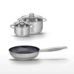 - DESCRIPTION : DESCRIPTION : Ce lot inclut une poêle céramique de 24 cm et deux faitouts inox de 16 cm et 24 cm, tous sans PFAS, offrant une cuisson saine et efficace.
