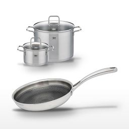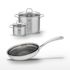 - DIMENSIONS : Poêle 24 cm, faitouts 20 cm (3,4 L) et 26 cm (9,5 L) pour des préparations de 2 à 4 personnes.