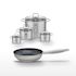 - COMPOSITION : Poêle en acier inoxydable avec revêtement sans PFAS, faitouts en inox avec couvercles en verre.