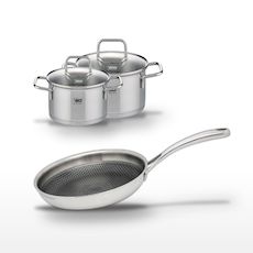 - COMPOSITION : COMPOSITION : Inox 18/10 pour la poêle et acier inoxydable pour les faitouts, avec un noyau en aluminium pour une répartition optimale de la chaleur.