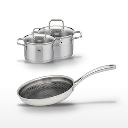 - PETIT + : PETIT + : Le revêtement ELODUR® Professional de la poêle assure une cuisson sans attache et saine, tandis que les faitouts conservent les vitamines des aliments grâce à leur fond capsulé.