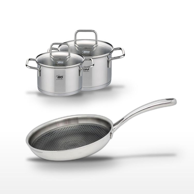 - DESCRIPTION : DESCRIPTION : Ce lot Elo propose une poêle 24 cm en inox 18/10 et deux faitouts 14 cm et 16 cm, parfaits pour des cuissons variées et saines grâce à un revêtement antiadhésif de haute qualité.