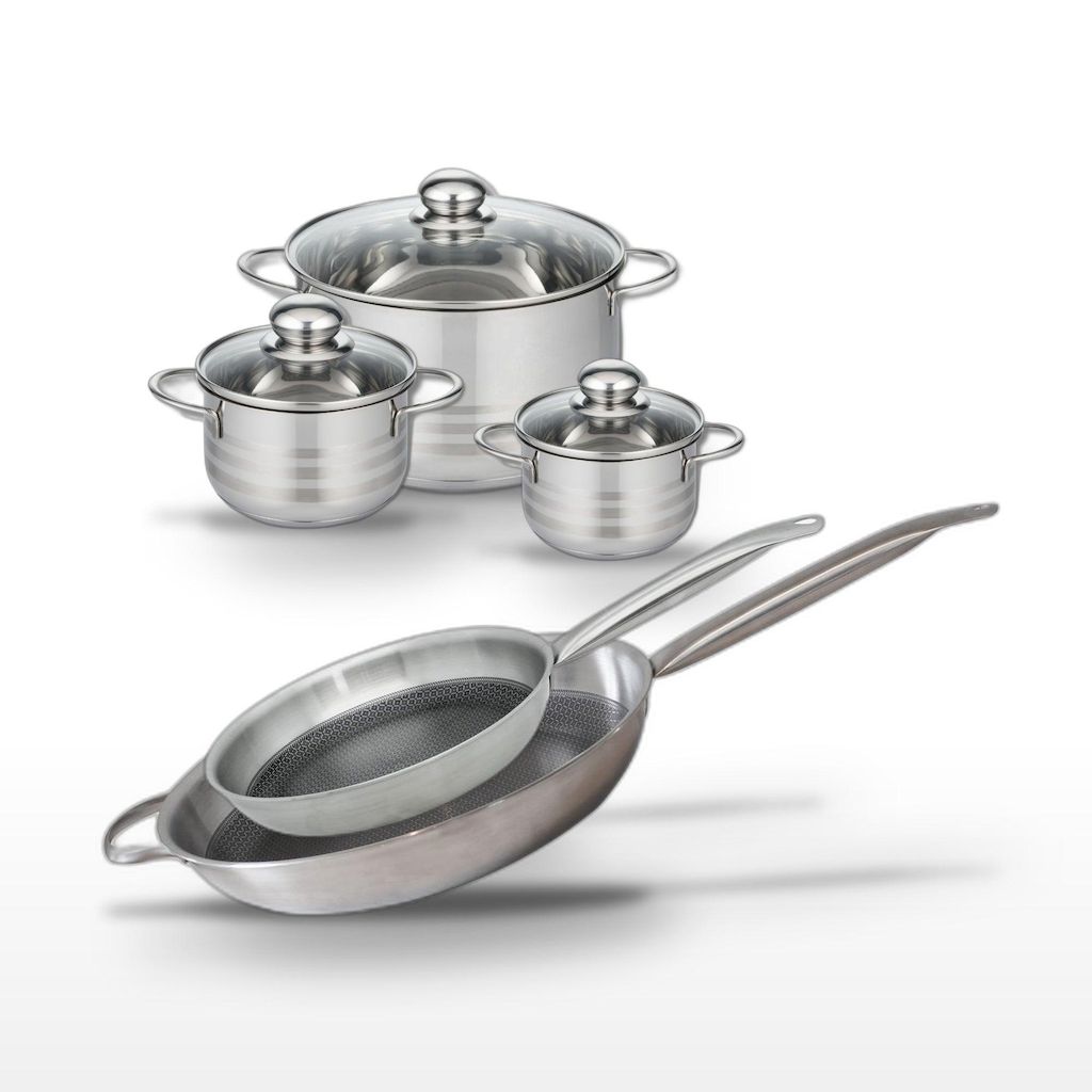 - COMPOSITION : COMPOSITION : Acier inoxydable 18/10, aluminium et acier pour les poêles , inox de haute qualité pour les faitouts.