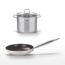 - COMPOSITION : COMPOSITION : Poêle en aluminium avec poignée inox, faitout en acier inoxydable 18/10 avec couvercle en verre.