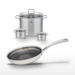 - DESCRIPTION : Ensemble Elo comprenant une poêle 28 cm et trois faitouts en inox, parfaits pour une cuisine variée et saine.