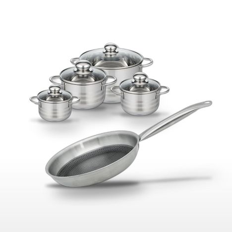 - COMPOSITION : Acier inoxydable 18/10 pour la poêle, inox pour les faitouts, avec couvercles en verre résistants aux chocs.