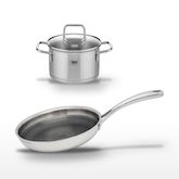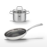 - COMPOSITION : Acier inoxydable 18/10 pour la poêle, acier inoxydable et verre pour le faitout, garantissant robustesse et durabilité.