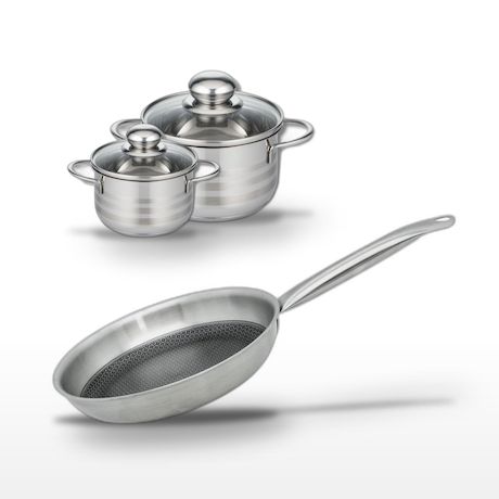 - COMPOSITION : COMPOSITION : Ensemble en acier inoxydable 18/10 avec revêtement antiadhésif ELODUR® Select sans PFAS, assurant durabilité et performance.