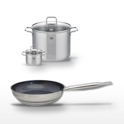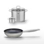 - COMPOSITION : COMPOSITION : Poêle en acier inoxydable avec revêtement sans PFAS et faitouts en inox avec couvercles en verre.