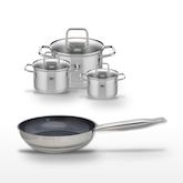 - COMPOSITION : COMPOSITION : Poêle en acier inoxydable avec revêtement sans PFAS, faitouts en acier inoxydable avec couvercles en verre.