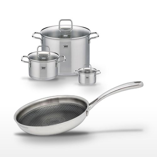 - COMPOSITION : Acier inoxydable 18/10 et verre pour les couvercles. La poêle dispose d'un revêtement ELODUR® Professional pour une résistance accrue.
