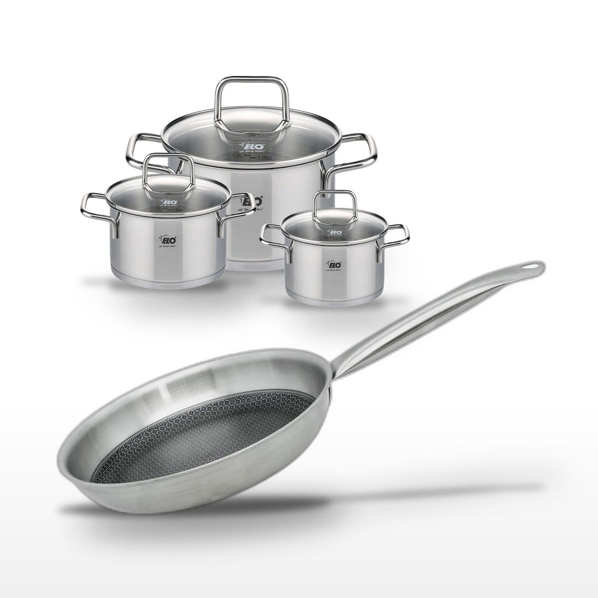 - COMPOSITION : Poêle en acier inoxydable 18/10 avec revêtement ELODUR® Select, faitouts en acier inoxydable.