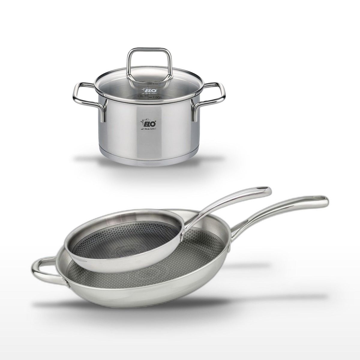 - DESCRIPTION : Ce lot Elo inclut deux poêles de 28cm et 32cm avec revêtement antiadhésif ELODUR®, et un faitout 14cm. Parfait pour des cuissons saines.