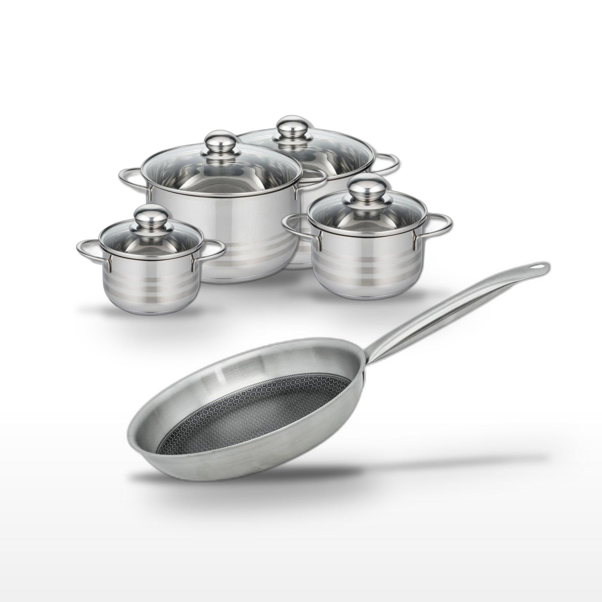 - COMPOSITION : COMPOSITION : Acier inoxydable 18/10 pour la poêle, inox pour les faitouts, tous sans PFAS pour une utilisation sûre.