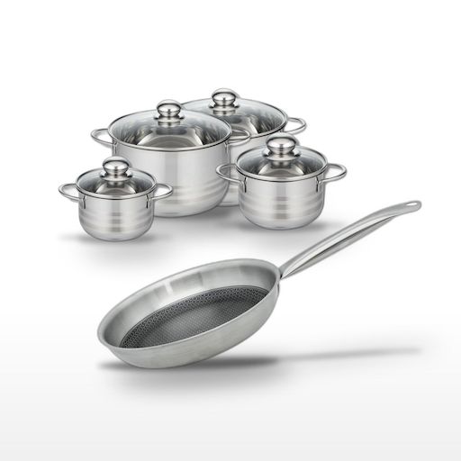 - DESCRIPTION : DESCRIPTION : Ce lot Elo comprend une poêle 28 cm et quatre faitouts (14/16/20/24 cm) en acier inoxydable, tous sans PFAS pour une cuisine saine.