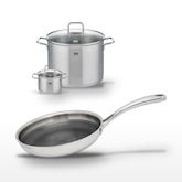- COMPOSITION : Acier inoxydable 18/10 pour la poêle, acier inoxydable et verre pour les faitouts, garantissant robustesse et durabilité.