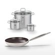 - COMPOSITION : Poêle en aluminium et inox avec revêtement céramique sans PFAS, faitouts en acier inoxydable avec couvercles en verre.