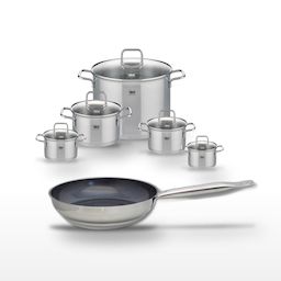 - COMPOSITION : COMPOSITION : Poêle en acier inoxydable avec revêtement sans PFAS, faitouts en inox avec couvercles en verre.
