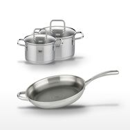 - COMPOSITION : Acier inoxydable de haute qualité pour la poêle et les faitouts, avec un couvercle en verre pour les faitouts.