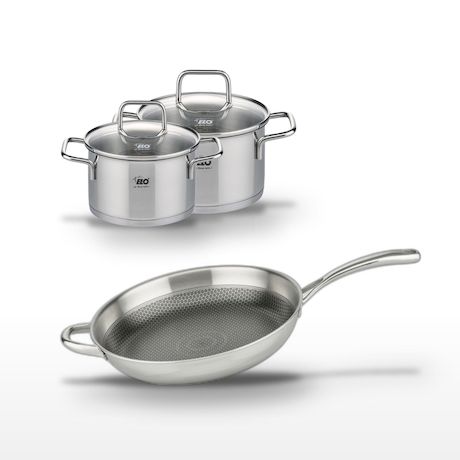 DESCRIPTION : Ce lot Elo Relief Evolution offre une poêle 32 cm et deux faitouts en inox, parfaits pour des cuissons variées et homogènes.PETIT + : La poêle est équipée d'un revêtement antiadhésif ELODUR® Professional sans PFAS, et les faitouts préservent les vitamines des aliments.COMPOSITION : Aci