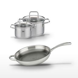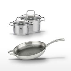 - COMPOSITION : Acier inoxydable de haute qualité, revêtement antiadhésif pour la poêle, fond capsulé pour les faitouts, tous avec couvercle en verre.