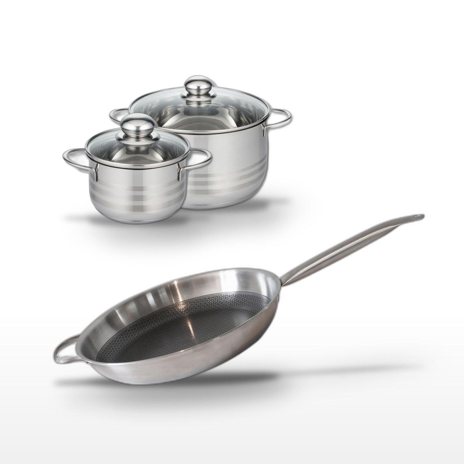- COMPOSITION : Poêle et faitouts en acier inoxydable 18/10 avec revêtement ELODUR® Select sans PFAS. Fond capsulé pour une répartition homogène de la chaleur.
