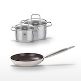 - COMPOSITION : Poêle en aluminium et inox avec revêtement céramique, faitouts en acier inoxydable avec couvercles en verre.