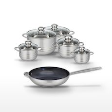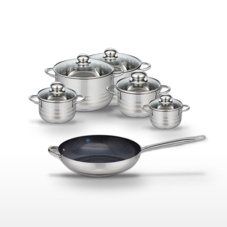 - COMPOSITION : Poêle en acier inoxydable avec revêtement ELODUR® et faitouts en inox de haute qualité.