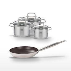 - COMPOSITION : COMPOSITION : Poêle en aluminium et inox, faitouts en acier inoxydable, tous avec couvercles en verre.